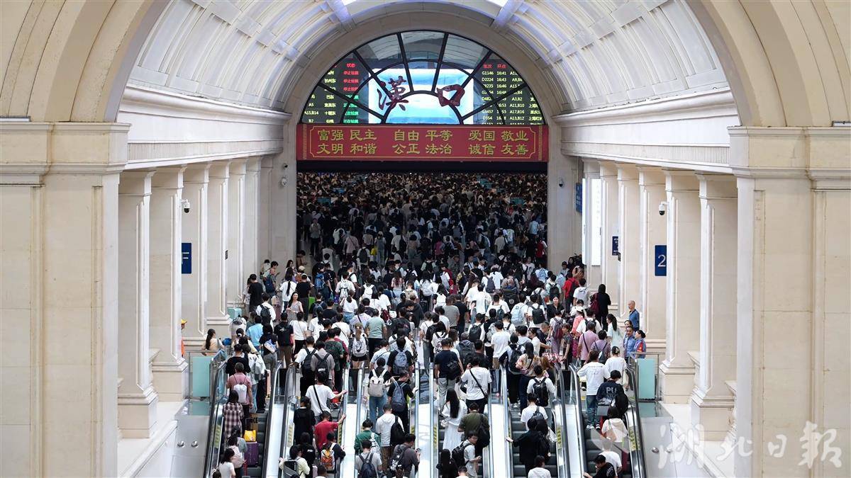 “十一”前夕的汉口火车站,人潮如织。候车大厅内,拖着行李箱的旅客们或低头刷着手机,或与同伴轻声交谈,空气中弥漫着对即将开启的旅程的期待。